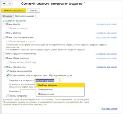 В сценарии товарного планирования выбираем одну из трех стратегий расчета потребностей в материалах: Наиболее вероятную, Оптимистичную или Пессимистичную.