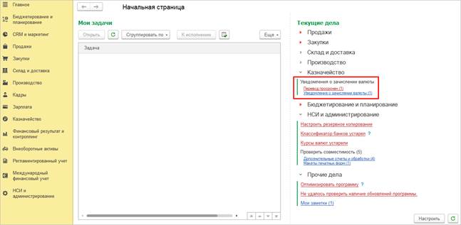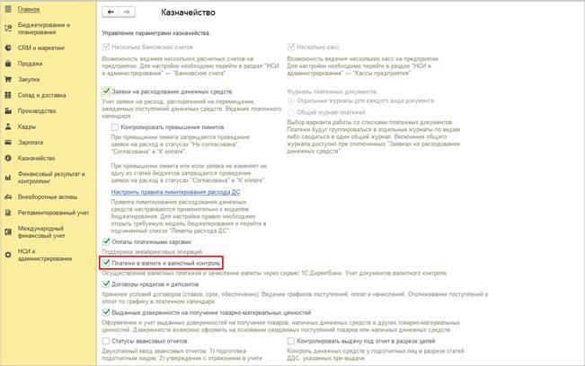 Для начала работы требуется включение функциональной опции НСИ и администрирование – Казначейство - Платежи в валюте и валютный контроль.