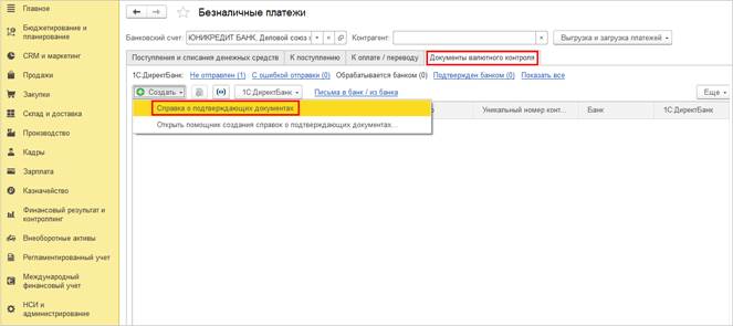 При этом в рабочем месте Казначейство – Банк – Безналичные платежи становиться доступной вкладка Документы валютного контроля, использование которой позволяет создавать Справки о подтверждающих документах как самостоятельно, так и с применением помощника.