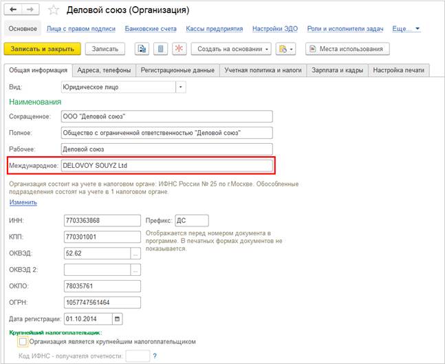 Одновременно, в справочниках НСИ и администрирование - Организации и Контрагенты появляется возможность заполнения регистрационной информации на английском языке. Для этого в карточке организации или контрагента предусмотрены поля Наименования – Международное (вкладка Общая информация) и Международный адрес для платежей (англ.), вкладка – Адреса, телефоны.