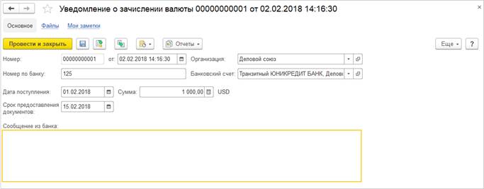 Данное уведомление оформляется специалистом банка и может быть загружено в информационную базу из рабочего места Казначейство – Банк – Безналичные платежи в процессе сеанса прямого обмена с банком по команде 1С:ДиректБанк – Синхронизировать с банком.