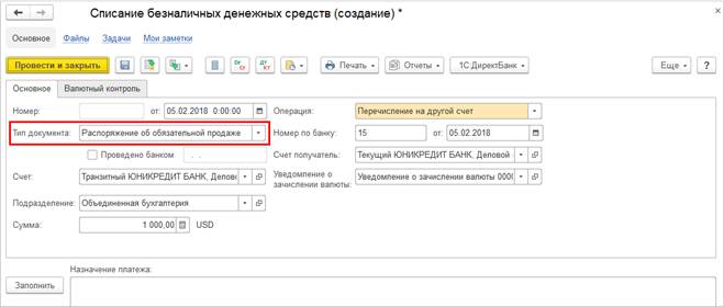 Далее, требуется выполнение процедуры обязательной продажи валюты, в результате которой осуществляется перевод денежных средств с транзитного счета на текущий, а основанием для создания Списания безналичных денежных средств с типом документа Распоряжение об обязательной продаже служит Уведомление о зачислении валюты. Конвертация иностранной валюты, при этом, осуществляется с использованием отдельного документа с одноименным видом хозяйственной операции.