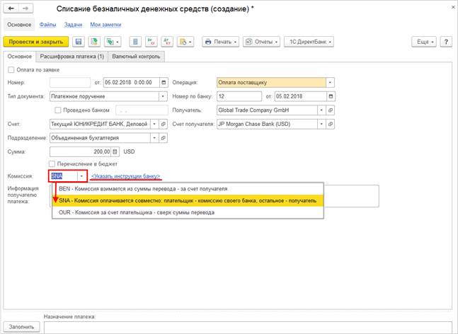 Аналогично документам списания безналичных денежных средств, ввод данных о способе оплаты комиссии и инструкциях банку, возможен при создании в иностранной валюте документа Заявка на расходование денежных средств.