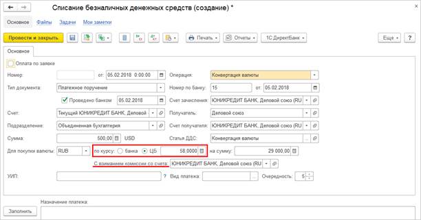 С целью пополнения остатка рублевого расчетного счета организации не редко прибегают к операциям продажи иностранной валюты за рубли РФ. Для этого предусмотрен документ Списание безналичных денежных средств - Конвертация валюты, при заполнении, которого, доступен выбор курса конвертации и счета взимания комиссии за совершаемую банком валютно-обменную операцию.