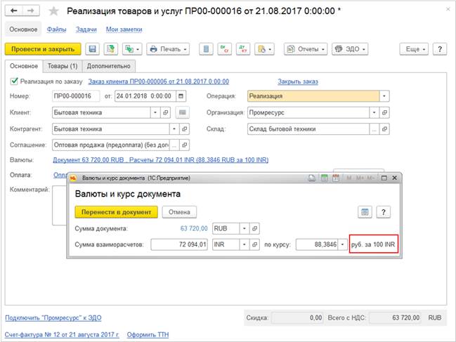 Кратность заполняется из регистра сведений Курсы валют и отображается только если Кратность отличается от единицы. Кратность в документах выводится справочно и не редактируется.