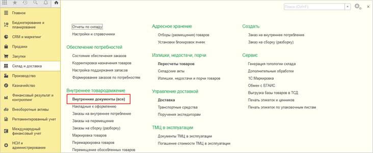 Все документы складского движения внутри организации, в том числе перемещение, внутреннее потребление списания недостач отображаются в списке документов Внутренние документы. В списке документов предусмотрен отбор по организации, складу и менеджеру, а также по видам документов. Колонка Комментарий по умолчанию скрыта и может быть добавлена из меню Еще – Изменить форму. В нижней части формы выведены гиперссылки на формы списков документов, которые могут выступать основаниями для документов внутреннего складского движения: Заказ на внутреннее потребление, Заказа на перемещение, Заказ на сборку (разборку) и другие, а также ссылка на товарно-транспортные накладные.