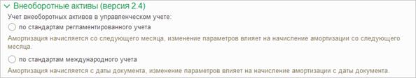 Обратите внимание, что выбор режима амортизации для управленческого учета по стандартам регламентированного учета приведет к тому, что при расчете амортизации будут применяться формулы, как для регламентированного учета. Раньше для упр. учета всегда применялись формулы международного учета, настройка влияла только на выбор периода начисления.