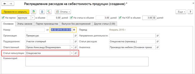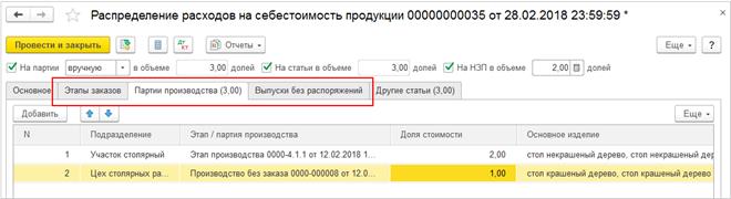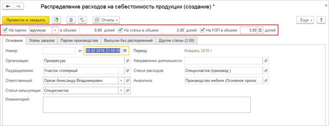 Постатейные расходы могут быть распределены на партии производства, оставлены в незавершенном производстве или перераспределены на другие статьи расходов (статьи активов / пассивов). Правила распределения постатейных расходов задаются в одноименном справочнике и уточняются при распределении. Правило распределения можно настроить комплексно, одновременно указав распределение на партии и статьи расходов и доли стоимости для каждого варианта: