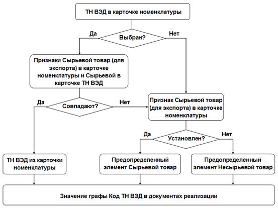 В связи с тем, что при совершении операций экспорта принадлежность товара к сырьевому должна определяться кодом вида товара в соответствии с единой Товарной номенклатурой внешнеэкономической деятельности Евразийского экономического союза (далее – ТН ВЭД), изменен порядок отнесения номенклатурных позиций к сырьевым товарам. Признак Сырьевой товар (для экспорта) удален из карточек номенклатуры. Принадлежность номенклатурных позиций к сырьевым определяется по выбранным в них элементам списка ТН ВЭД, в которые добавлен признак Сырьевой. В документах Реализация товаров и услуг и Корректировка реализации с вариантом налогообложения Экспорт (0%), а также документах Запись книги продаж, реквизит Код ТН ВЭД добавлен в отдельную графу табличной части и заполняется при выборе номенклатуры.