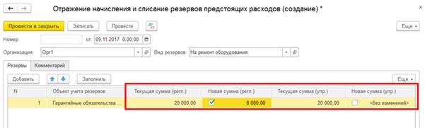 Для начисления и отражения сумм изменения резервов предстоящих расходов предназначен документ Отражение начисления и списания резервов предстоящих расходов. В документе текущая оценка резерва по каждому объекту указывается пользователем и сравнивается с оценкой резерва, имеющейся в учете. В зависимости от результата сравнения выполняется списание или доначисление резерва. Отражение операций начисления и списания резерва выполняется в соответствии с параметрами, указанными в карточке объекта учета резервов предстоящих расходов.