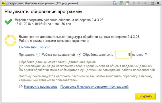 Чтобы задействовать многопоточное обновление, следует выбрать Приоритет обработки данных в НСИ и администрирование – Обслуживание – Результаты обновления и дополнительная обработка данных. По умолчанию будет задействовано 8 потоков. Это значение можно изменить в поле справа от Приоритет обработки данных. Рекомендуемое значение равно количеству ядер процессора сервера 1С:Предприятия (следует учитывать требования назначения функциональности для сервиса заданий).