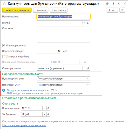 Для ТМЦ в эксплуатации возвращена видимость порядка погашения стоимости, который больше не используется, для работы с периодом до 2021 года. Теперь в категории эксплуатации порядок погашения стоимости отображается и доступен для изменения, при этом отображается подсказка, что с 2021 г. данные реквизиты не используются.