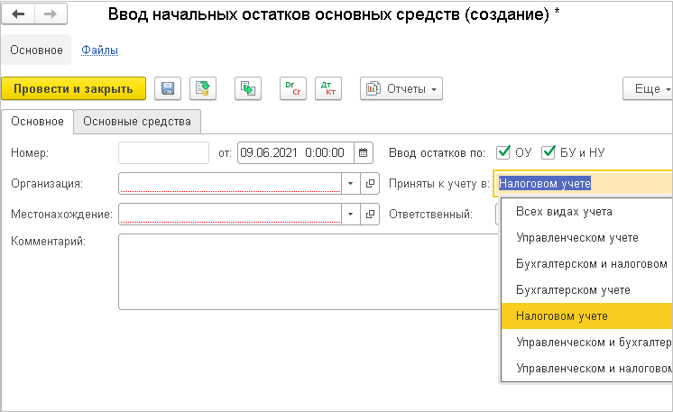В документы ввода начальных остатков основных средств добавлена возможность ввода остатков только в налоговом учете, а также разные комбинации: в бухгалтерском и налоговом учете, в управленческом и налоговом учете и т.д.