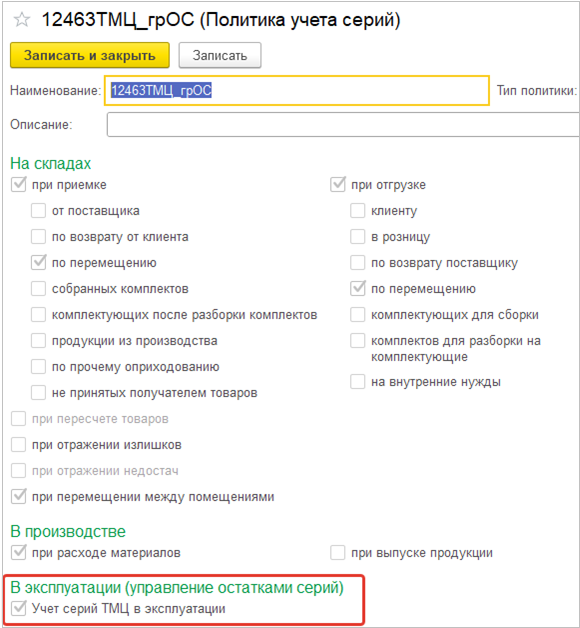 Для учета серий ТМЦ в эксплуатации в политике учета серий нужно включить настройку Учет серий ТМЦ в эксплуатации.