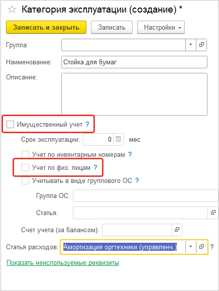 Для учета ТМЦ в виде группового ОС необходимо в Категории эксплуатации включить Учет в виде группового ОС.