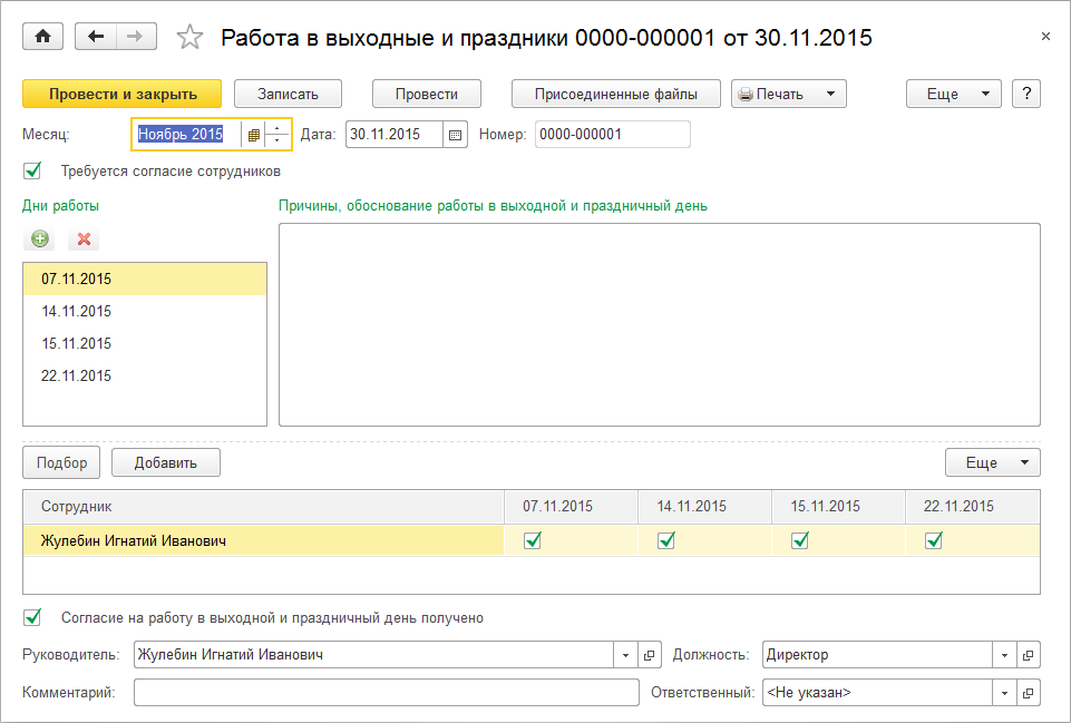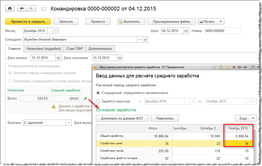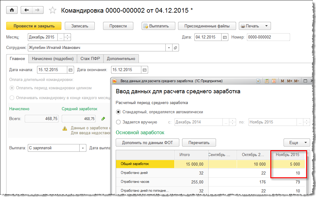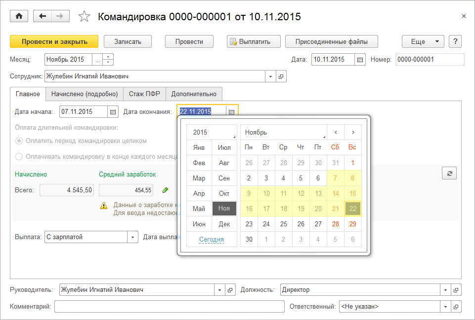 Например, сотрудник, работающий по пятидневке, был отправлен в командировку в период 07.11.2015 – 22.11.2015.