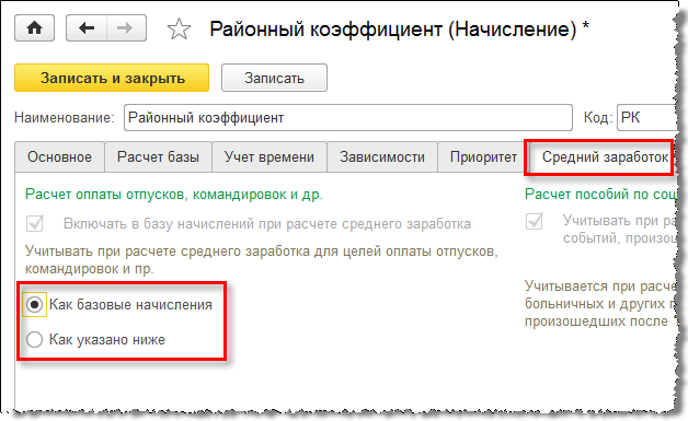 При учете РК и СН в среднем заработке в программе они учитываются целиком как общий заработок, независимо от того, как учитываются начисления, составляющие их расчетную базу.