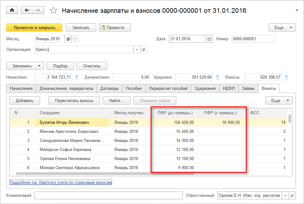В версии 3.0.24 реализован раздельный учет взносов начиная с расчетов 2016 года. Теперь сразу же при начислении можно увидеть, какая часть взносов начислена «до превышения», а какая – свыше.