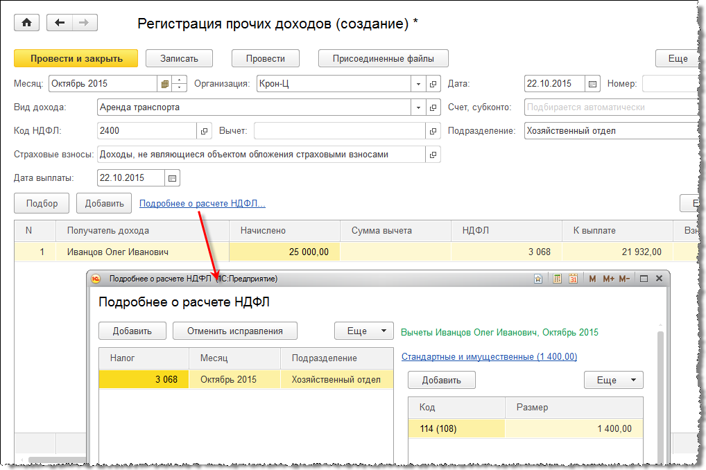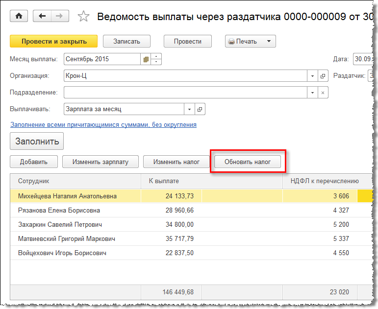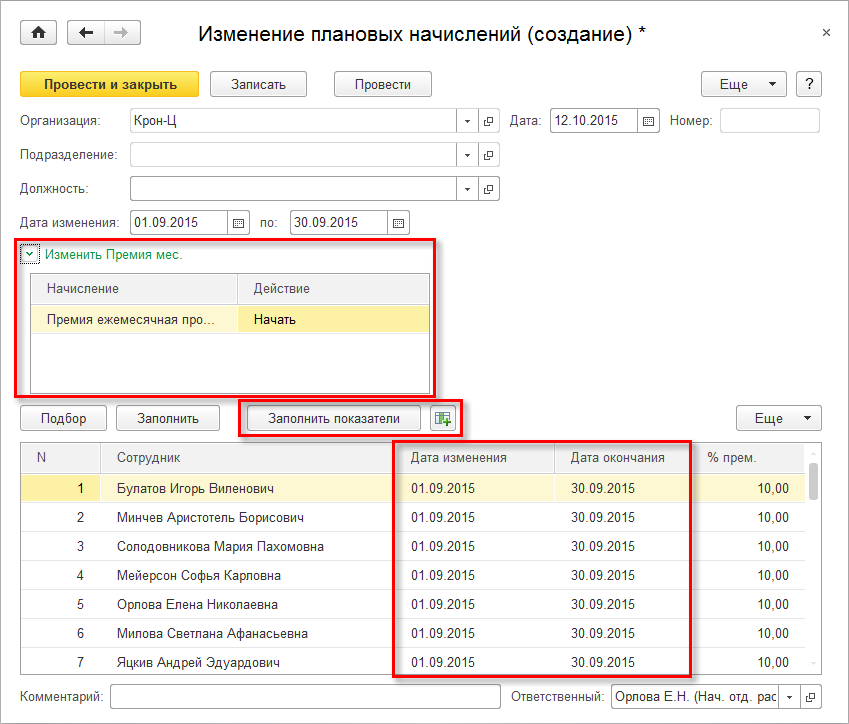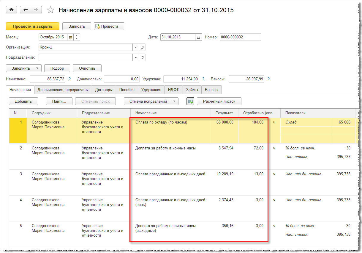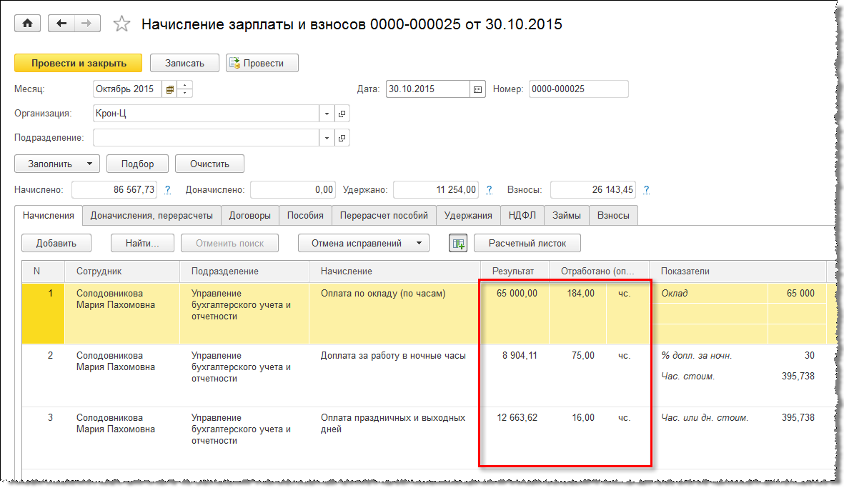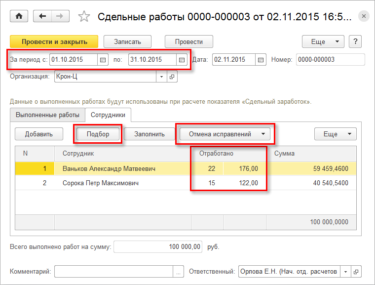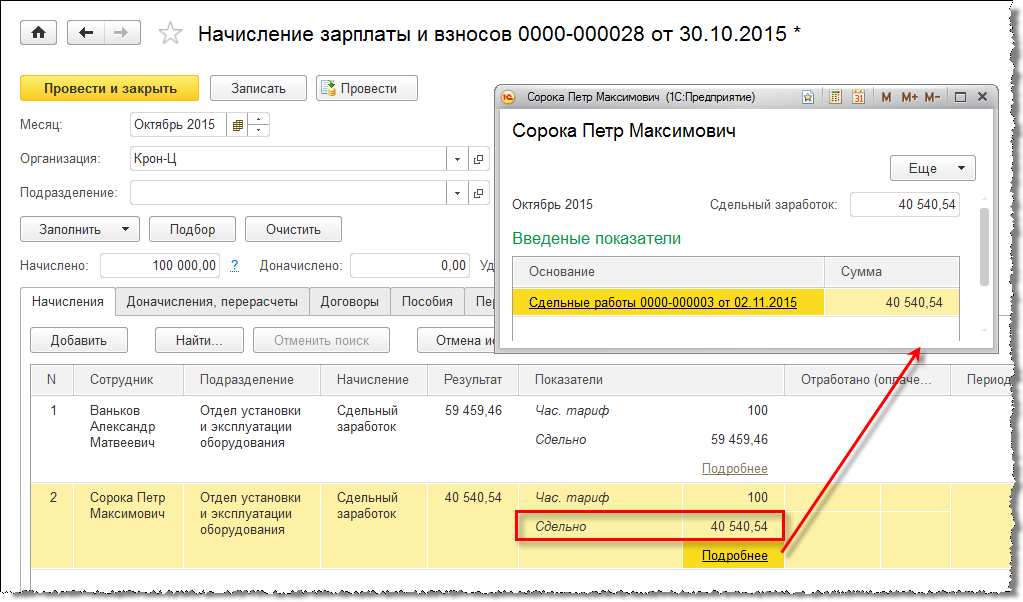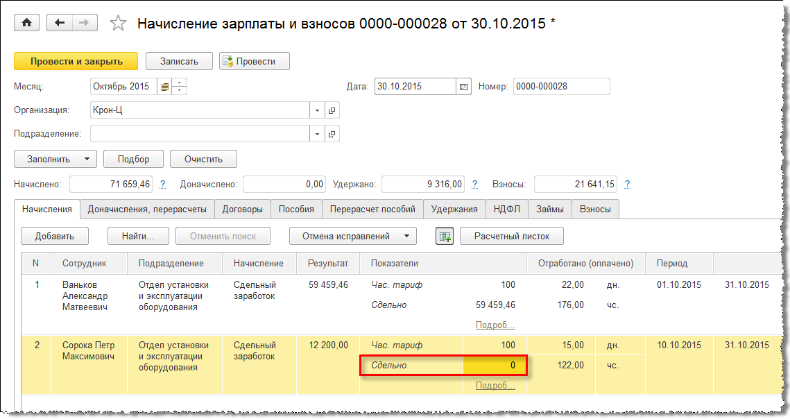 Например, в рассматриваемом примере второй сотрудник был принят на работу 10.10.2015, а вся сумма сдельной выработки будет зарегистрирована сводно на 01.10.2015.