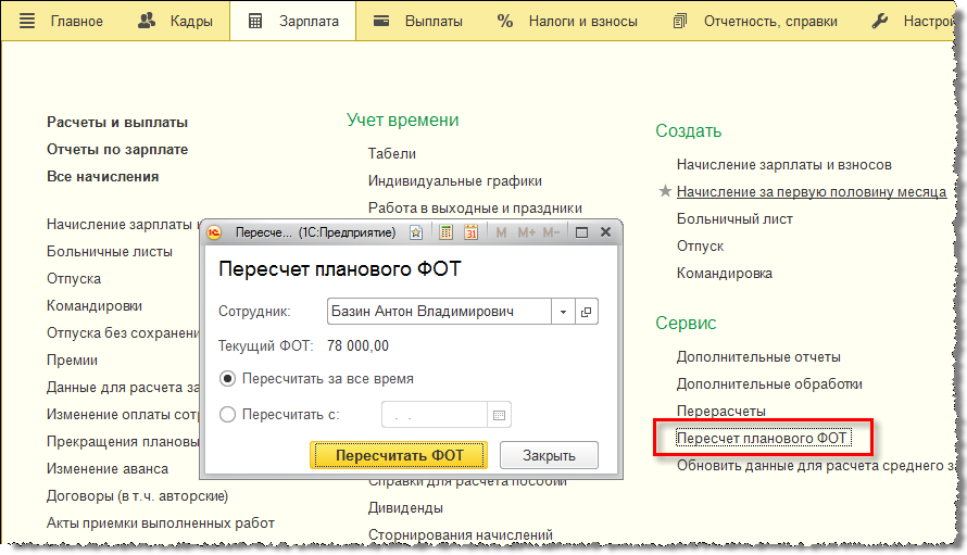 Также в программу добавлен сервисный инструмент «Пересчет планового ФОТ» (раздел «Зарплата – Сервис»). Им можно воспользоваться, если плановый ФОТ сотрудника по какой-то причине оказался неточным – будет произведен его пересчет по имеющимся в программе данным.