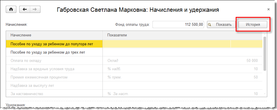 В разделе «Начисления и удержания» карточки сотрудника в дополнение к возможности посмотреть его актуальные плановые начисления добавлена возможность ознакомиться и с историей их изменения по новой кнопке «История».