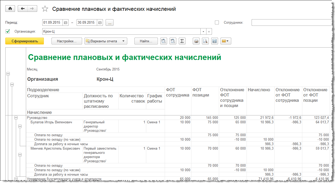 В отличие от уже имеющегося отчета «Анализ ФОТ по начислениям», в этом отчете фактические начисления выводятся по всем видам, а не только по составляющим плановый ФОТ.
