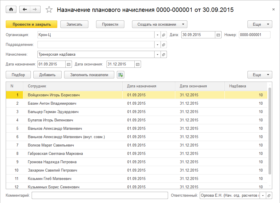 Новый документ «Назначение планового начисления» позволяет назначить одно выбранное начисление списку сотрудников. Но, в отличие от документа «Изменение плановых начислений», он обладает дополнительной функциональностью: позволяет назначить сотруднику одно и то же начисление несколько раз по разным основаниям.