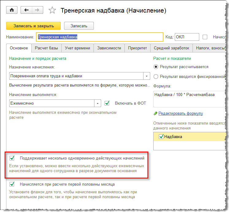 Обращаем внимание, что назначить несколько раз по разным основаниям можно не все начисления, а только отмеченные новым специальным признаком «Поддерживает несколько одновременно действующих начислений».