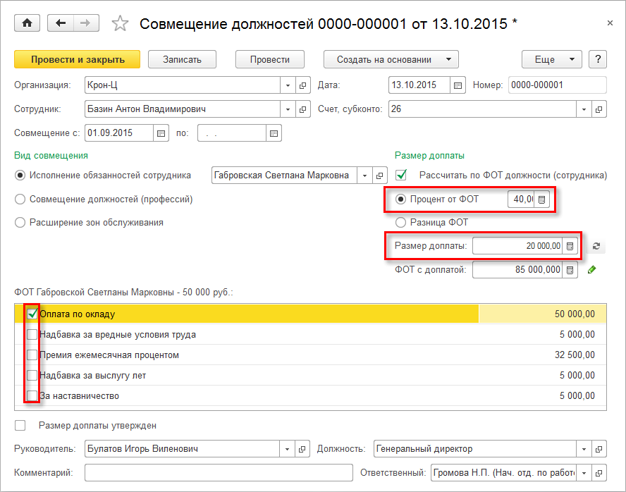 Кроме того, при назначении доплаты за совмещение с учетом ФОТ замещаемого сотрудника или должности реализована возможность учитывать не все, а только выбранные начисления.