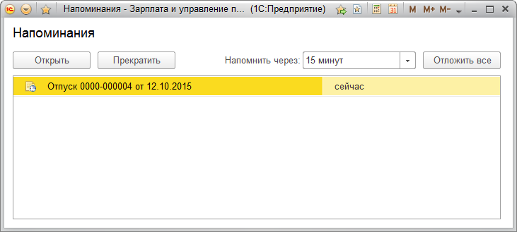 В указанное время (которое можно гибко настраивать, в том числе относительно дат, имеющихся в самом документе) автоматически откроется окно с напоминанием. Напоминание можно прекратить или отложить.
