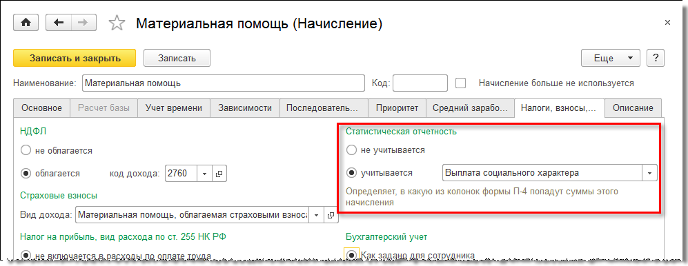 Для начислений реализована возможность указать, как они должны учитываться при заполнении статистической формы П-4.