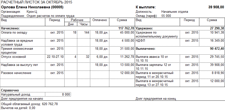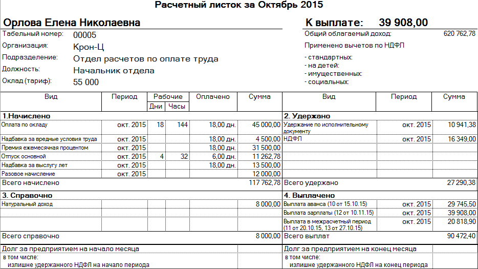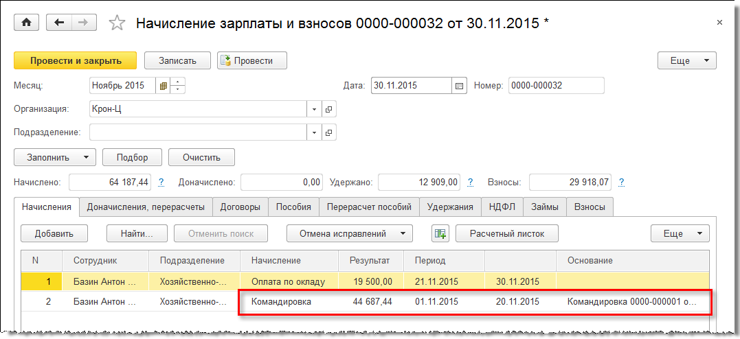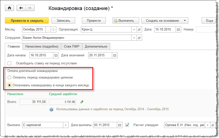 Например, если командировка начинается 16.10.2015 и заканчивается 20.11.2015, то в этом случае в самом документе будет начислена оплата только за октябрь.