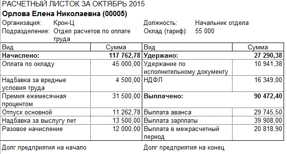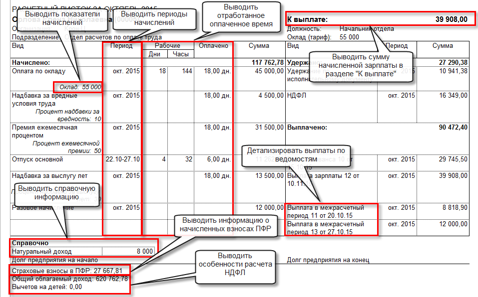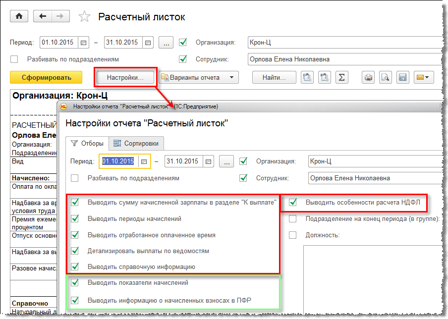 Также добавлены настройки, позволяющие, напротив, выводить дополнительную информацию. В частности, реализована возможность выводить в расчетный листок информацию о начисленных по сотруднику взносах в ПФР.