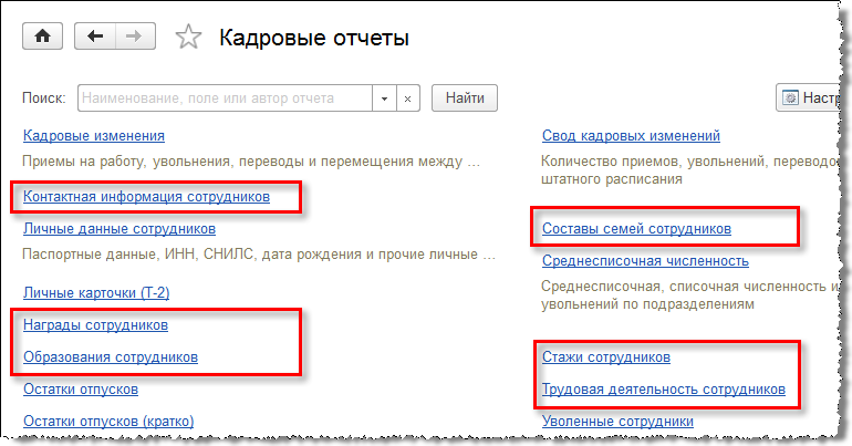Они доступны в разделе «Кадры – Кадровые отчеты».