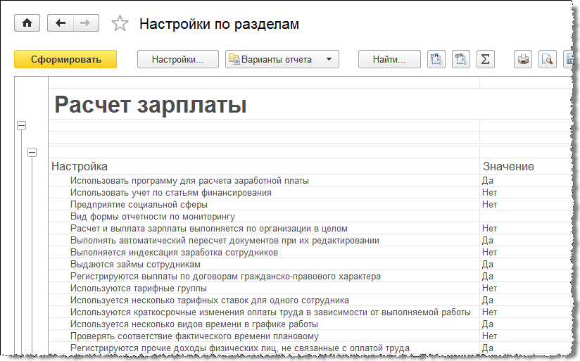 Отчет по учетной политике организации можно сформировать непосредственно из справочника, а по настройкам кадрового учета и расчета зарплаты – из соответствующих панелей в разделе «Настройка».