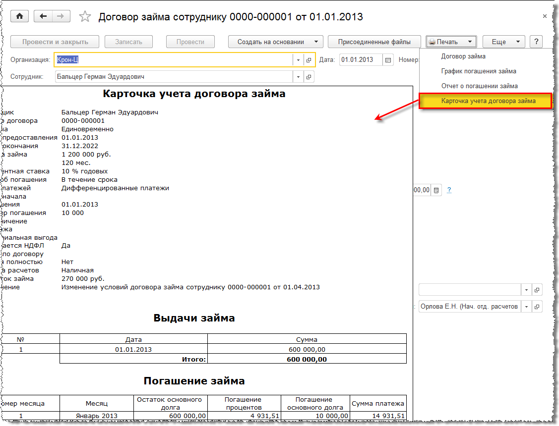 В документ «Договор займа» добавлена новая печатная форма – карточка учета договора займа. В ней отражаются реквизиты и условия договора, история расчетов по нему, а также актуальный на момент печати график погашения займа.