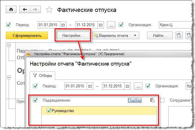 В отчет «Фактические отпуска» добавлена возможность формирования по подразделениям. Также расширен состав полей, доступных для настройки отчета (добавлена должность и др.)