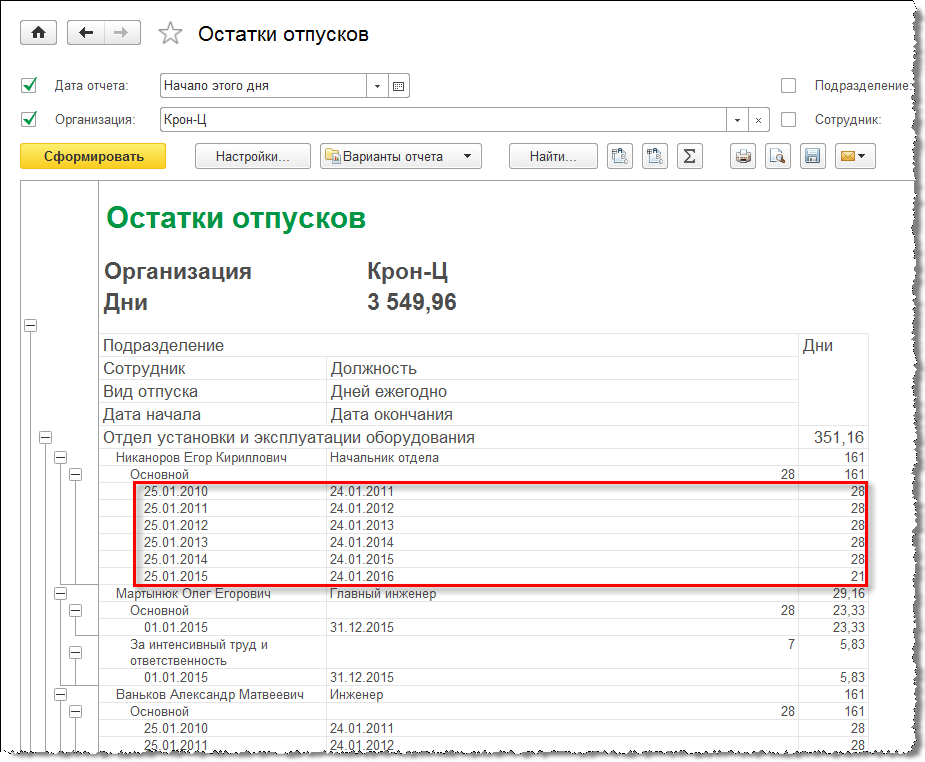 В отчете «Остатки отпусков» остатки теперь выводятся с детализацией по рабочим годам.