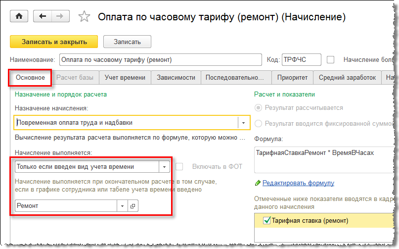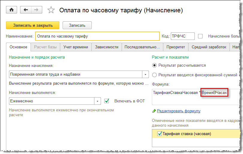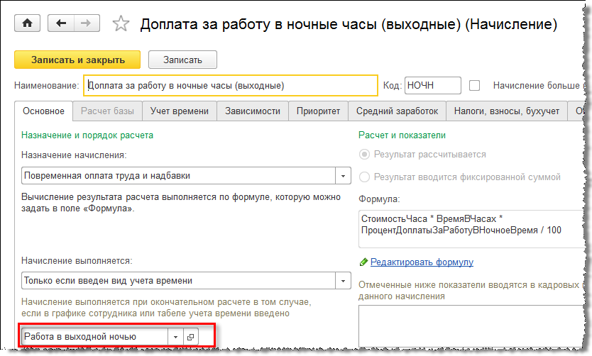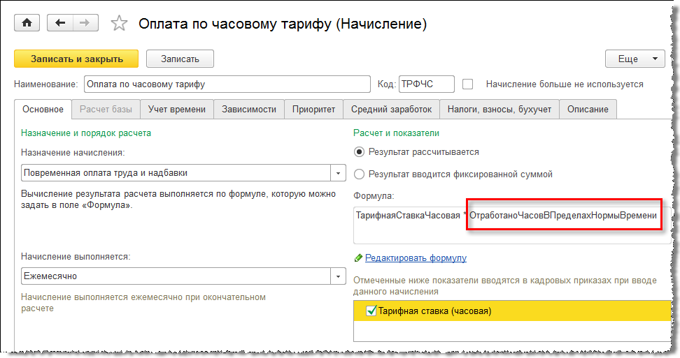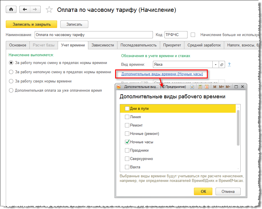 При этом если для расчета начисления требовалось учитывать несколько видов времени, то была возможность учитывать только все их сразу с помощью показателя ОтработаноЧасовВПределахНормыВремени. Например, для расчета оплаты по часовому тарифу требуется учитывать не только часы явки (работу в дневное время), но и ночные часы.