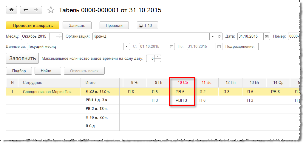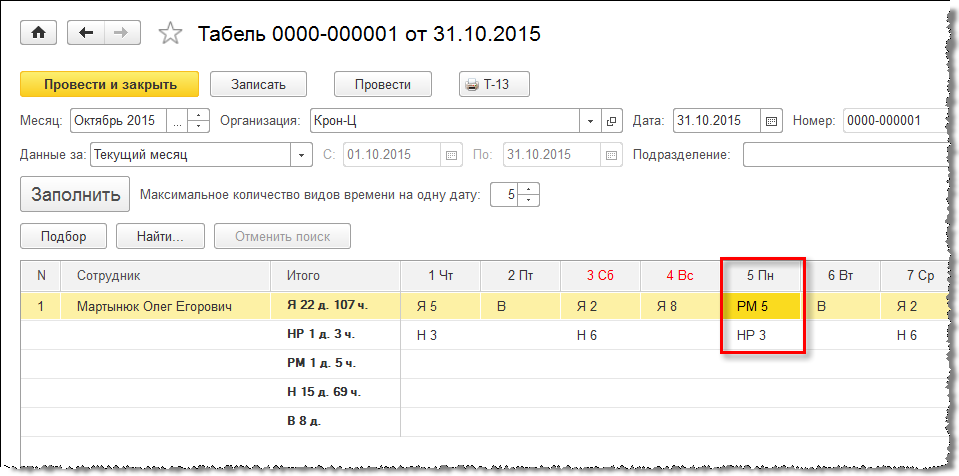 За указанный в документе период (или день) заполняется фактически отработанное сотрудниками время согласно данным, имеющимся в программе (графикам, документам-отклонениям, табелям).