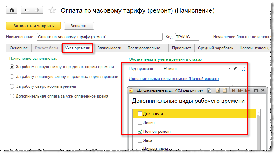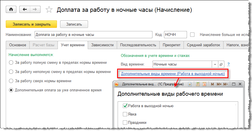 Для снятия этих ограничений в версии 3.0.24 реализована возможность для начисления указывать несколько видов времени, по которым при его расчете будет определяться отработанное время (с использованием показателей ВремяВЧасах или ВремяВДнях).