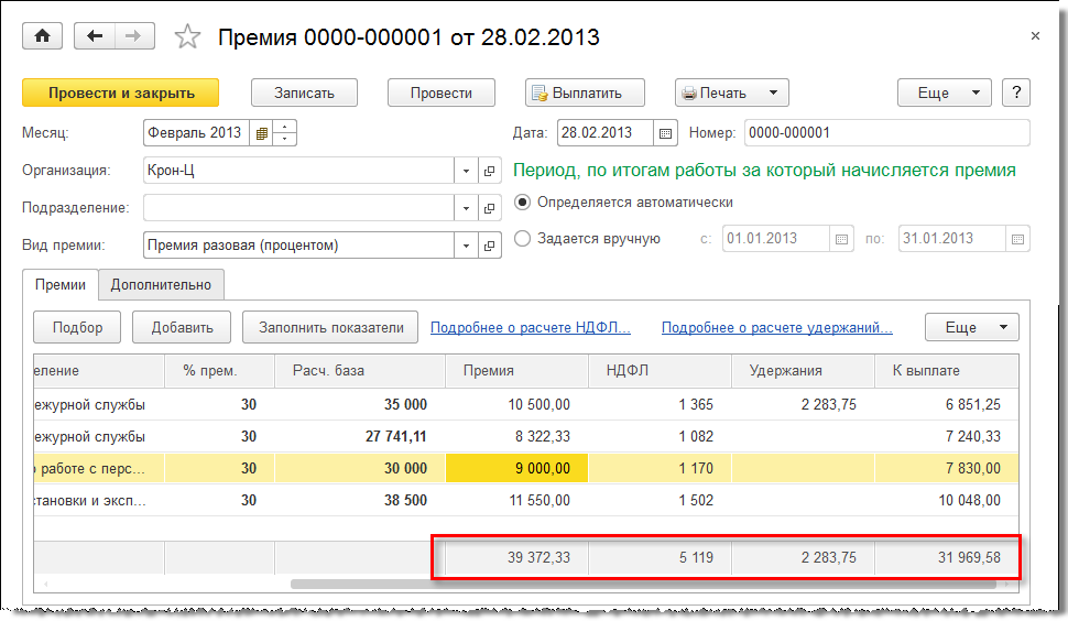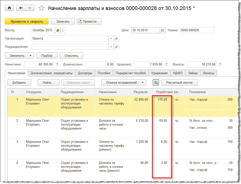 Общая сумма по наряду распределяется с учетом отработанного каждым сотрудником времени (пропорционально дням или часам, в зависимости от вида тарифной ставки сотрудника).