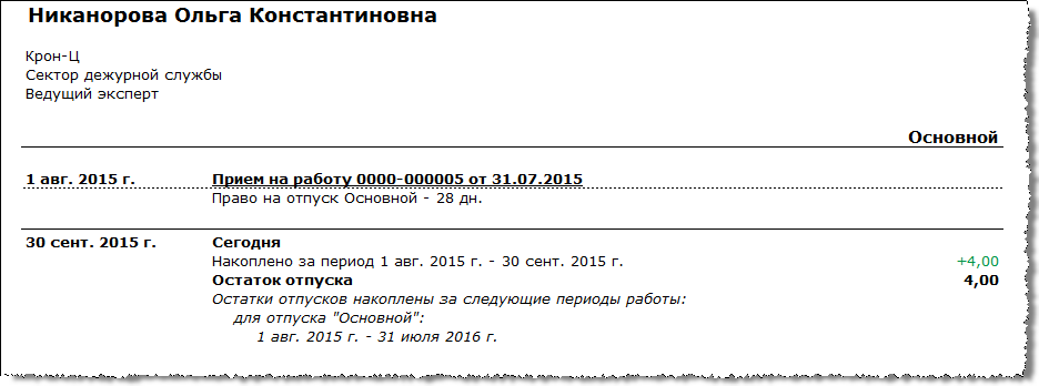 По пожеланиям пользователей в версии 3.0.24 поведение программы изменено. Теперь если сотрудник с краткосрочным трудовым договором не был уволен, остатки его отпусков автоматически исчисляются исходя из «стандартного» права на отпуск в календарных дня. А к последующему месяцу добавляются «компенсационные» остатки за два предыдущих (условно говоря, за этот месяц полагается 3 дня вместо 2,33).