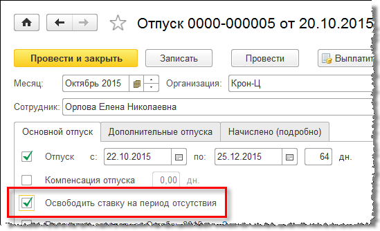 Возможность освободить занимаемую сотрудником штатную единицу добавлена при оформлении отпусков и отгулов.