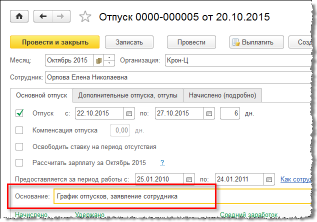 В документы «Отпуск» и «Отпуск без сохранения оплаты» добавлено поле «Основание», текст из которого используется при формировании приказа Т-6.