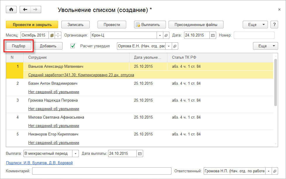 Также отметим, что в документе «Данные для расчета зарплаты» появилась возможность подобрать сотрудников, а не только добавлять их по одному или заполнять сразу всех.