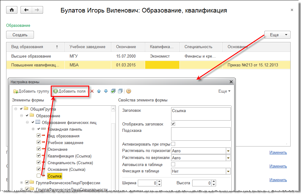 Добавлена возможность настройки раздела «Образование, квалификация» карточки сотрудника. Например, в таблицу со сведениями об образовании можно вывести дополнительные колонки.