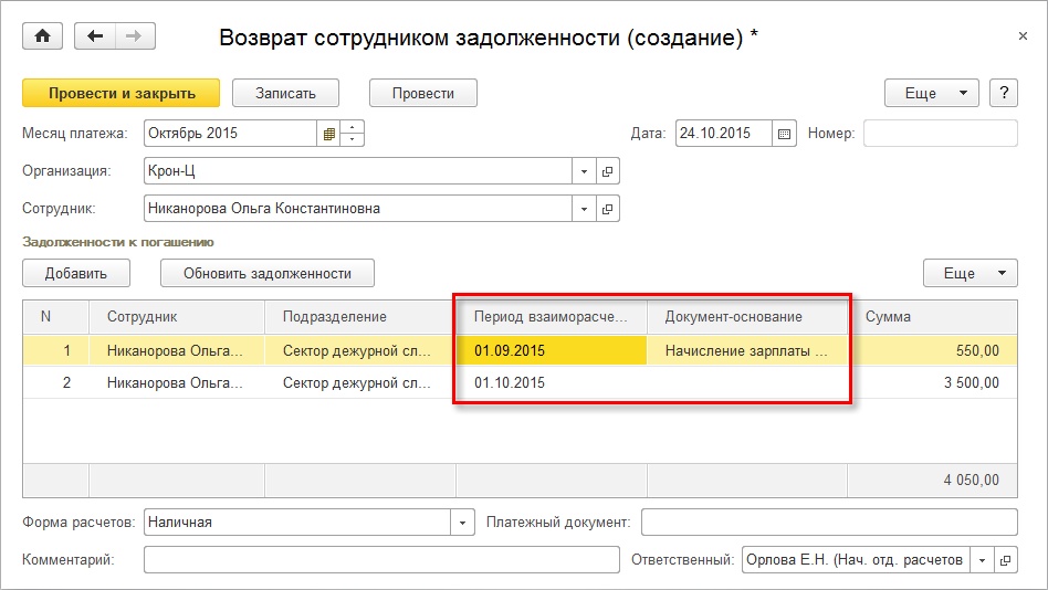 Теперь в документе «Возврат сотрудником задолженности» суммы можно явно детализировать по разрезам учета, как и в ведомостях.