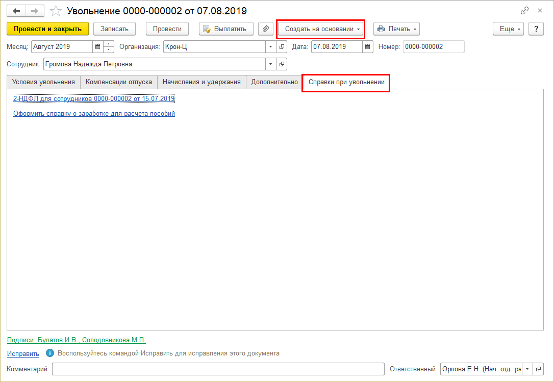 В эти документы добавлена закладка "Справки при увольнении", с которой можно либо оформить новые справки 2-НДФЛ и для расчета пособий, либо открыть ранее оформленные (последние). Так же, как и раньше, новые справки можно создать и через "Ввод на основании".