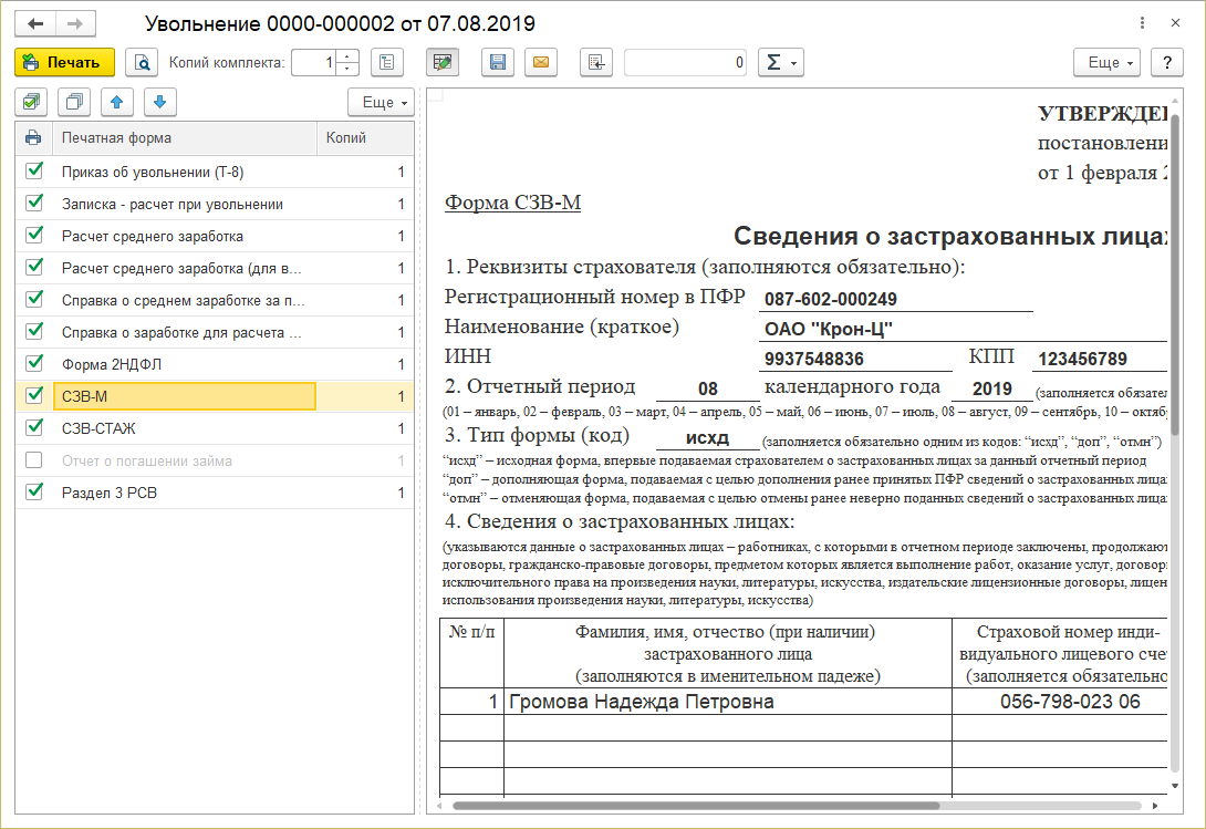 С помощью команды "Комплект документов при увольнении" распечатать сразу все требуемые формы.